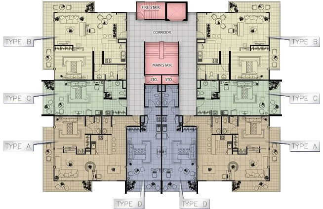MAXXCENTRAL floors provide a left and a right corridor wing hosting just only 2 studio apartments and 2 One-Bedroom-Suites of each type. Only four apartments per floor wing secure you a highly private living experience.