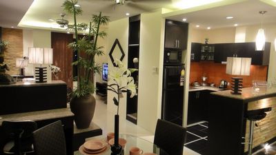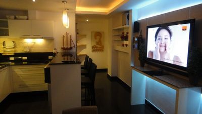 Your open plan kitchen including a breakfast-bar, a big 2-door fridge/freezer, a 4-head hob, a microwave oven and a separate dining area will make you feel like home. Each 1-Bedroom Suite Deluxe offers a separate working desk with High-Speed-Internet, Telephone, In-Room Safe and two 32-50" big Flat-Screen-TVs serving 100+ international channels for your convenience. |